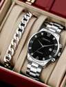 Set de 4 piezas para hombre que incluye: Reloj de cuarzo con esfera de tres ojos, pulsera de acero negro con tiras, collar cruzado de estilo hip-hop y anillo, adecuado para uso diario o como regalo de vacaciones para amigos
