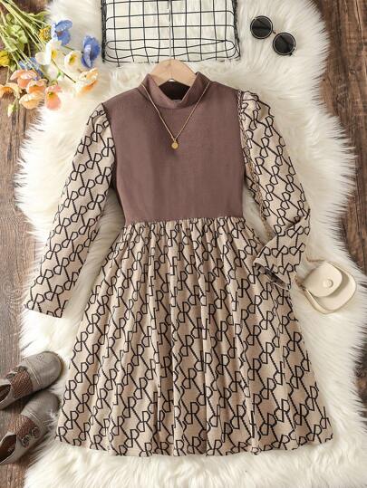 Vestido De Manga Larga Estampado Para Adolescentes - Marrón - Añade 3