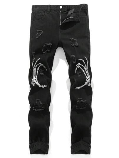 SHEIN Vaqueros rectos y holgados de uso diario y ropa de otoño para niños preadolescentes, con diseño de calavera, interior de felpa negra, corte desgarrado y rasgado, con forro para talla grande calidez, y sensación de diseño - Negro - Añade 1