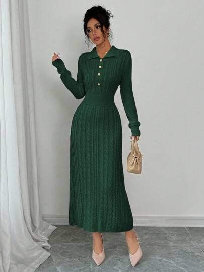 Chiquease Vestido de suéter elegante de mujer con diseño de botones metálicos de cuello alto y manga larga de unicolor, ideal para otoño/invierno - Verde Oscuro - Añade 3