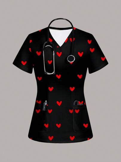 SHEIN Essnce Top de uniforme de enfermera informal con manga corta y estampado de corazones, adecuado para el verano - Multicolor - Añade 1