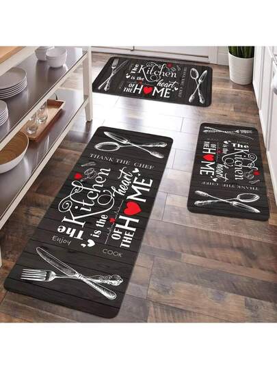 1/2/3 Piezas "La cocina es el corazón del hogar" Alfombra de piso de poliéster antideslizante, diseño de cuchillo y tenedor - Ligera, con respaldo antideslizante, duradera, adecuada para interiores y exteriores, alfombra decorativa de cocina | Alfombra de cocina para fiestas | Alfombra de poliéster, decoración de cocina - Multicolor - Añade 13
