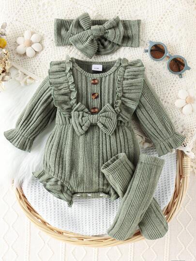 1 Set Bebé Niña Pelele de Manga Larga de unicolor + Diadema + Calcetines de Forro Polar, Peso Medio Delgado, Otoño/Invierno - Verde militar - Añade 1