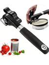 Abrelatas multifuncional de acero inoxidable, herramienta manual de cocina sin esfuerzo con mango de silicona antideslizante, diseño a prueba de salpicaduras y almacenamiento compacto | Amigable para personas mayores, uso en campamentos y en el hogar