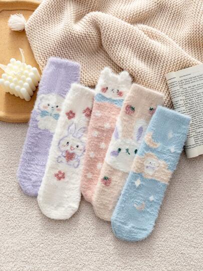 1/5 pares de calcetines suaves, cómodos y acogedores con diseño de conejo para mujer, ideales para el otoño/invierno - Multicolor - Añade 5