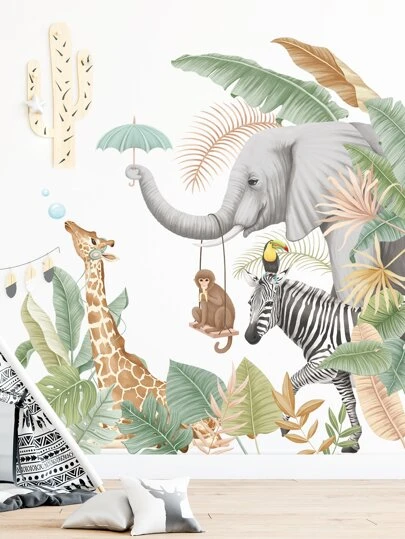 1 pieza Adhesivo de pared con elefante, jirafa, árbol de la selva tropical para fondo de pared, pegatinas, adhesivo de pared, adhesivo de vinilo para decoración del hogar, artículos de decoración de primavera para refrescar tu hogar, pegatinas de decoración de ramas - Multicolor - Añade 5