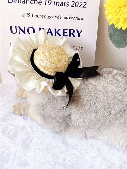 1 pieza Sombrero de paja para mascota con diseño de lazo para gatos & perros - Negro - Añade 1