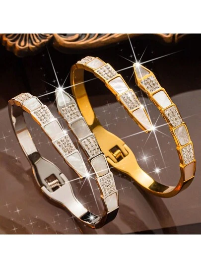 1 pieza Pulsera de acero inoxidable con incrustaciones de diamantes de imitación y hueso de serpiente con estilo INS fresco, adecuado para uso diario de mujeres en verano - Huesos de serpiente - Añade 1