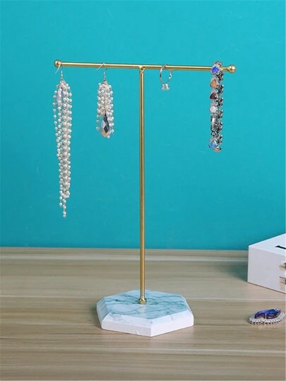 1 pieza Organizador de joyas con base de madera y patrón de mármol con agujero, soporte en forma de T para exhibir aretes, para mostrador, vitrina, caja organizadora, viaje y vuelta al colegio - Dorado - Añade 1