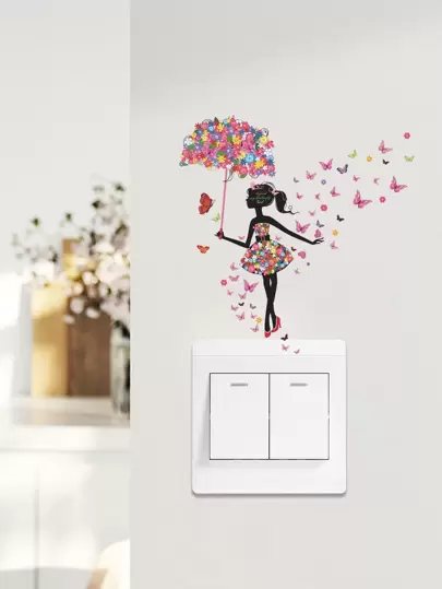 1 pieza Pegatina de pared autoadhesiva de PVC para interruptores y enchufes, con estampado de chica bailando y paraguas con flores, para decoración del hogar y fondo de sofá - Multicolor - Añade 4