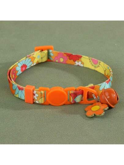 1 pieza Collar de gato de poliéster con estampado, hebilla ajustable de ABS transpirable, con campana y colgante de flor - Naranja - Añade 4