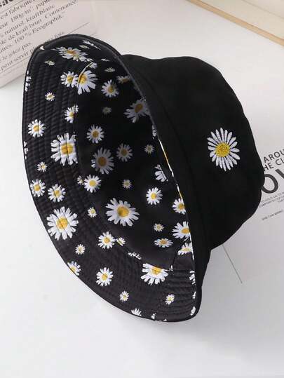 1 pieza Gorra de viaje reversible bordada con margaritas, apta para uso diario - Negro - Añade 6