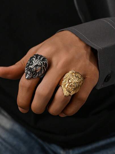 1 pieza Anillo de inoxidable chapado en oro de 18K con patrón de cabeza de león retro gótico, joyería de verano - anillo - Añade 2