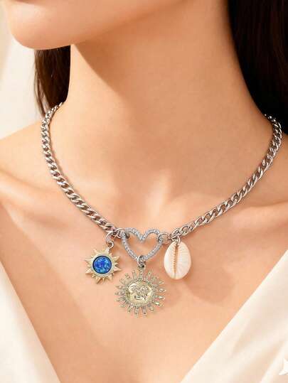 1 pieza Collar vintage lindo con corazón, colgante de sol y concha, collar gargantilla de diseño único, accesorio versátil - Multicolor - Añade 4