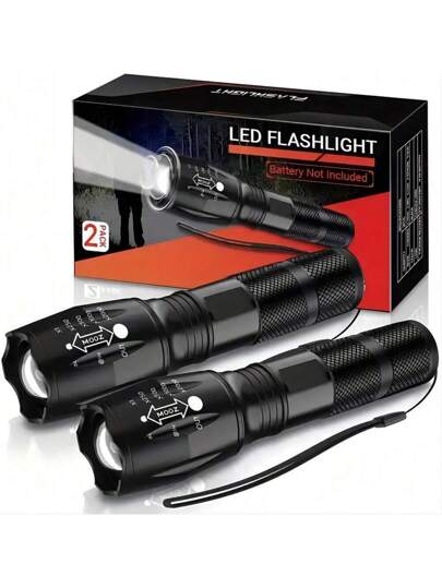2 Paquetes LED Linterna táctica zoomable a prueba de agua con brillo ajustable y 5 modos para acampar, hacer senderismo al aire libre (batería AAA de 3* no incluida) - Negro - Añade 2