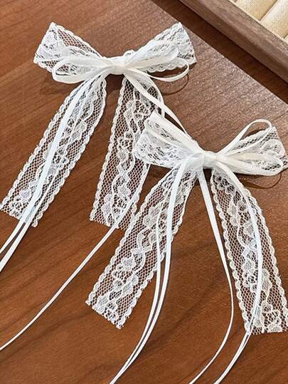2 piezas Clips para el cabello con lazo estilo coreano, elegante encaje con perlas y borlas, diadema de princesa con cinta, clips para el cabello de estilo ballet de alta gama - Blanco - Añade 2