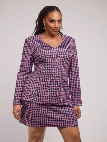 SHEIN Clasi Set de 2 piezas: Blusa de manga larga con botones y estampado y falda para tallas grandes, de moda - Rosa Fucsia - Añade 3