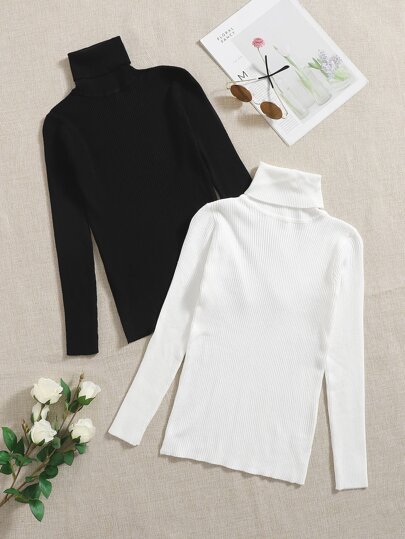 SHEIN Clasi 2 piezas Jersey unicolor cuello alto - Blanco y Negro - Añade 2