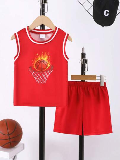 Set de 2 piezas con top de tirantes estampado de baloncesto y pantalones cortos de unicolor, estilo deportivo - Rojo - Añade 6