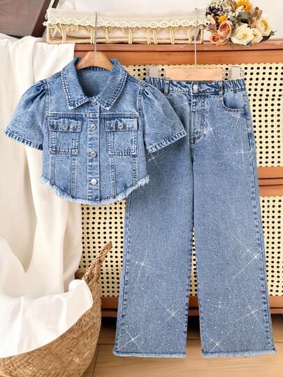 Conjunto de top y jeans de niña preadolescente con denim azul lavado y aplicaciones de rhinestones - Lavado ligero - Añade 1