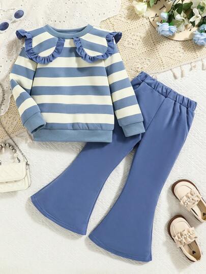Conjunto de 2 piezas para niña con Top de manga larga de cuello redondo con volantes en azul y blanco a rayas y pantalones sólidos - Azul y blanco - Añade 1