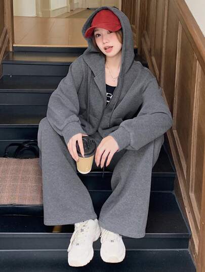DAZY Set de 2 piezas compuesto por sudadera con capucha de unicolor y pantalones de pierna ancha para mujeres - Gris - Añade 1
