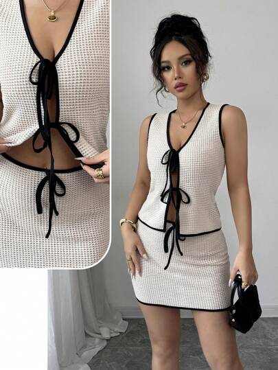 Chiquease Set de 2 piezas con top corto de escote en V y minifalda para mujer - Albaricoque - Añade 7