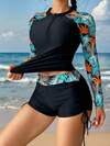Conjunto De Traje De Baño De Manga Larga Y Pantalones Cortos Con Estampado Tropical Para Mujeres