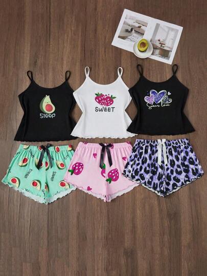 SweetSlumber Set de 3 piezas de pijama con estampado de dibujos animados, incluye camiseta de tirantes y shorts - Multicolor - Añade 4