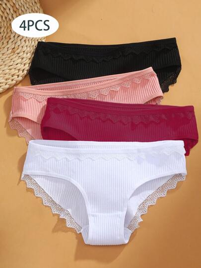 4 piezas de cómodas braguitas de triángulo en unicolor con ribete de encaje para mujeres - Multicolor - Añade 5