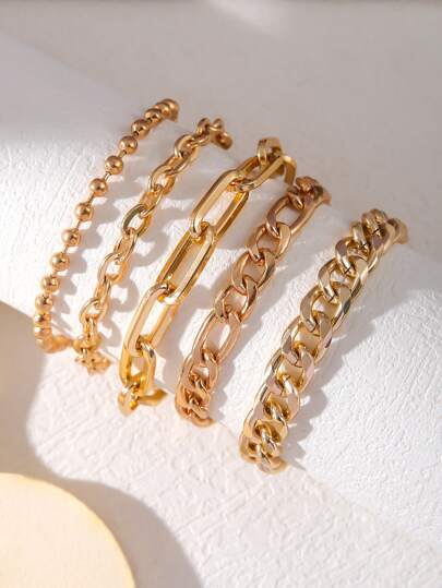 Set de 5 pulseras de cadena metálica de estilo punk rock gruesa, conjunto de pulseras doradas ajustables y de varias capas para mujeres - Amarillo Oro - Añade 5