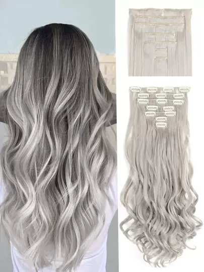 Extensiones de cabello con clip 4 piezas, piezas para cabello largo y ondulado con efecto mechas, extensiones sintéticas para el cabello completo con clips para mujeres - Gris - Añade 1