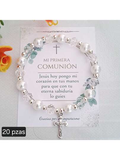 Pulseras ajustables Recuerdo Primera Comunión Cristal y Perla Blanca con bolsita de celofán - BLANCO 20PIEZAS - Añade 6