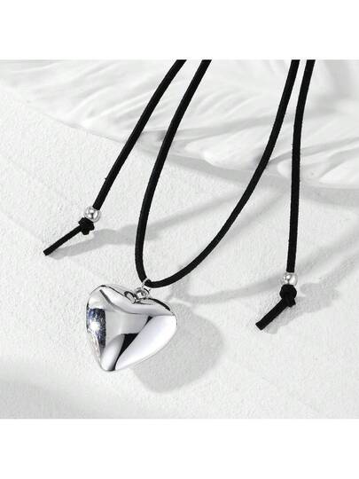 Collar De Terciopelo Ajustable Con Colgante De Corazón Grande Y Cordón Regulable, El Cordón Puede Ser Estilizado De Diferentes Maneras A Según Sus Preferencias - Plateado - Añade 2
