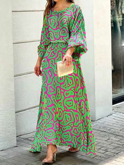 Vestido de manga de farol con estampado total - Verde - Añade 1