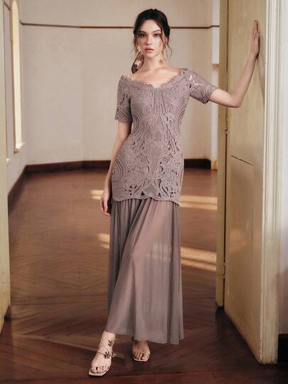 Anewsta Elegante vestido mini de mujer con hombros descubiertos, ajustado, de línea A, con volantes y parches de malla soluble - Púrpura polvoriento - Añade 1