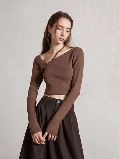 Jersey corto de cuello asimétrico tejido de canalé - Café integral - Añade 1