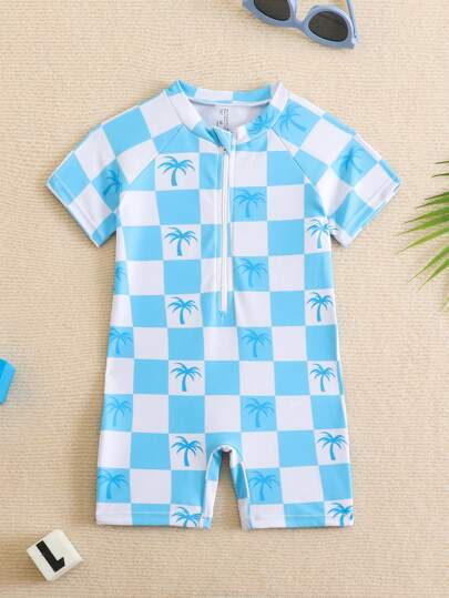 Traje de baño de una sola pieza con estampado de tablero de ajedrez y árbol de coco para bebé niño, para vacaciones en la playa - Celeste - Añade 1
