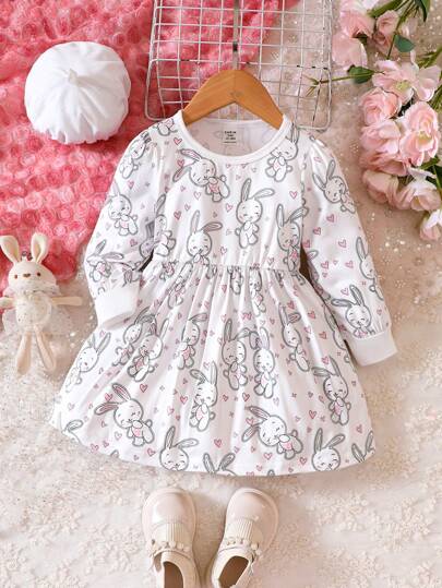 Bebé niña Vestido con estampado de conejo de dibujos animados - Blanco - Añade 1