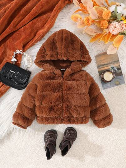 Chaqueta larga con capucha y cremallera de unicolor y peluda para bebé niña - Marrón - Añade 1