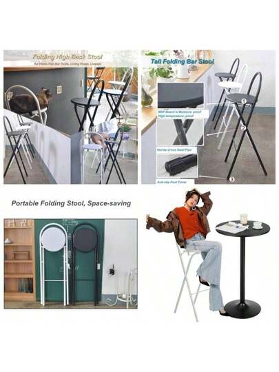 Folding Bar Stool Portable with Backrest Footrest, Counter Height Foldable Stool, White Tall Bar Folding Chair, Round Kitchen High Chair, Breakfast Camping Outdoor - 2 piezas + 65 cm/26 pulgadas - Añade 1