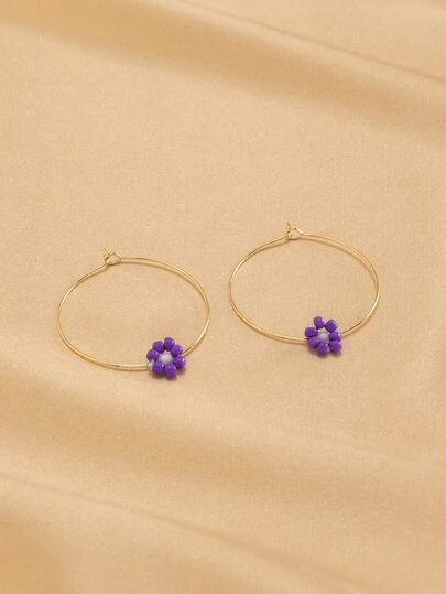 Pendientes de aro con cuenta con diseño de flor - Morado - Añade 1