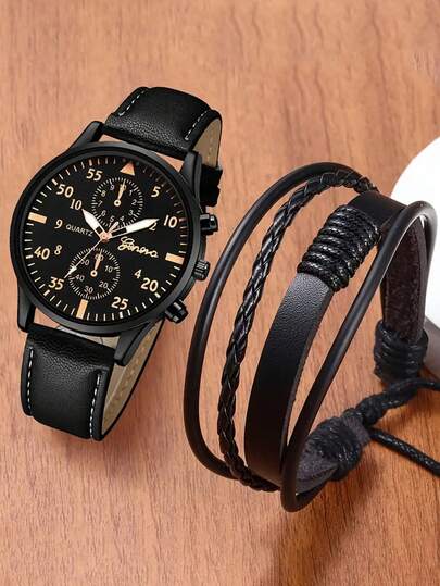 Reloj De Hombre Con Diseño De Dos Discos En Negro Y Dorado Con Juego De Pulseras - Negro - Añade 1