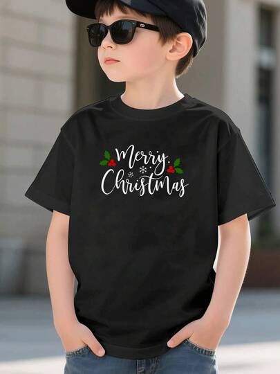 Camiseta de manga corta para niño con estampado navideño alegre, diseño moderno de copos de nieve y hojas verdes, tejido suave y cómodo para verano - Negro - Añade 10