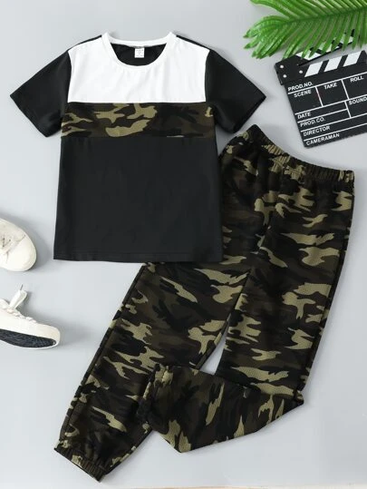 Chicos Pantalones deportivos con camiseta con estampado de camuflaje de color combinado - Multicolor - Añade 5