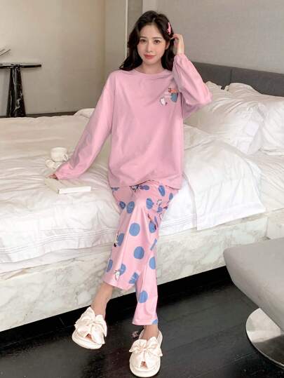 DAZY Set homewear con estampado de dibujos animados y letra de hombros caídos - Rosa - Añade 1