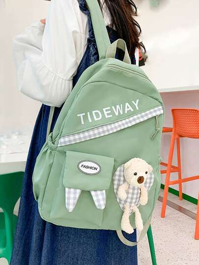 Mochila funcional con diseño de oso de dibujos animados con estampado de letra - Verde - Añade 5