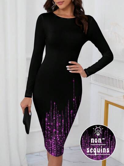 SHEIN Clasi Vestido de mujer de manga larga y cuello redondo con patrón de strass de imitación, adecuado para primavera y otoño - Negro - Añade 2