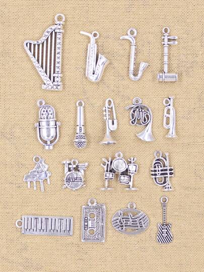 Colgantes de color plateado con forma de instrumentos musicales: saxofón, guitarra, batería, micrófono, piano, corneta, trompeta y arpa para hacer manualidades DIY - Plata antigua - Añade 19