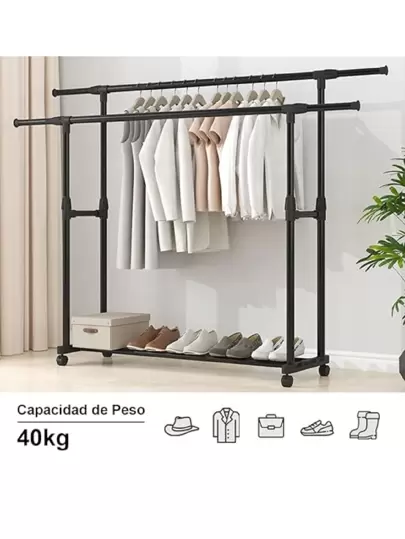 Perchero para Ropa de Doble Raíl ,Percheros Burro Ajustable con Ruedas Bloqueables,Burros Percheros de Ropa Resistente,lo Que es Muy Adecuado para Balcón, Baño, Dormitorio y Lavandería - Negro - Añade 2